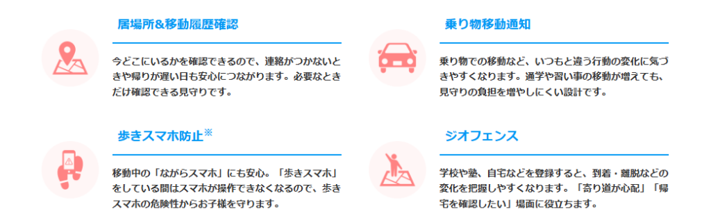 - 歩きスマホ通知:歩きながらスマホを使うと保護者へ通知