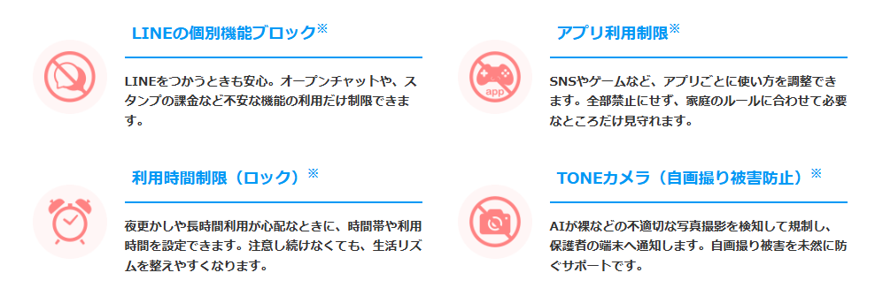 - SNSの個別機能制限:LINEのトーク機能のみ許可、InstagramのDMを制限など細かな設定が可能