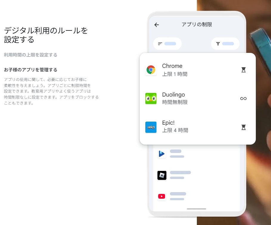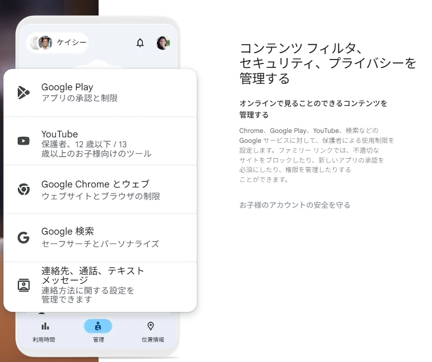 Chromeブラウザのセーフサーチ・Google PlayのコンテンツレーティングおよびYouTubeの視聴制限を保護者側から設定できます。