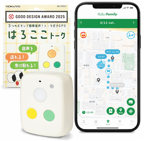 2025年6月に、音声メッセージ機能を追加した後継機「はろここトーク」が発売されました。はろここトークでは「きく・はなす・しらせる」の3ボタン設計で、子どもと保護者が音声でやり取りできます。