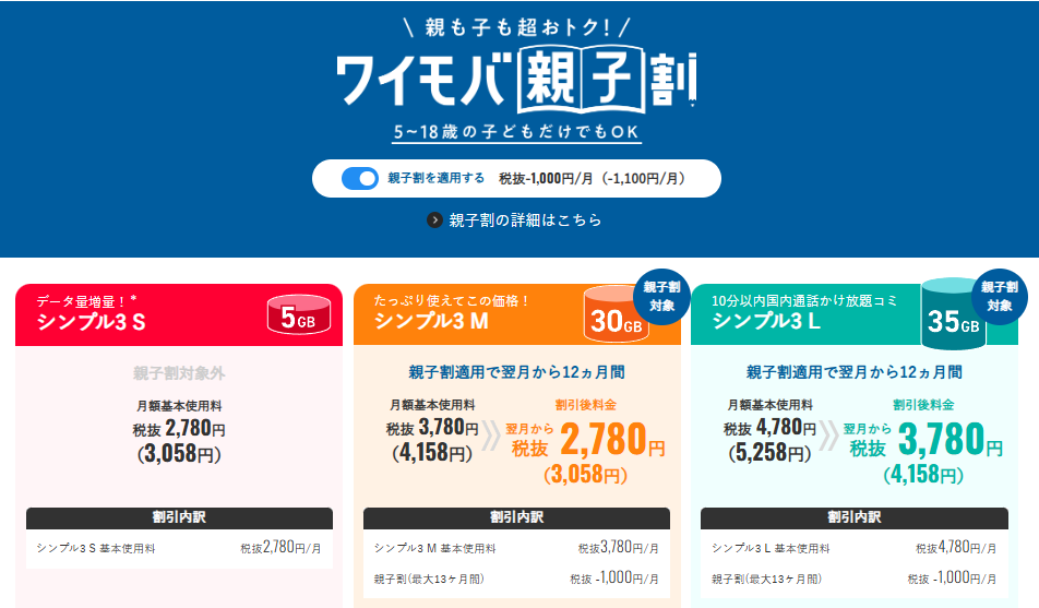 - ワイモバ親子割(2025年11月13日〜):5〜18歳が対象。シンプル3 M/Lで13ヶ月間1,100円/月割引。子どもだけでも親子セットでも適用可