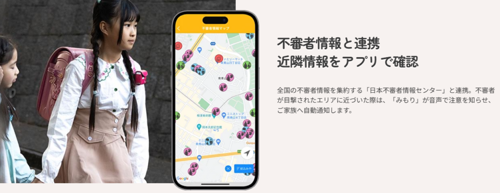 みもりGPSトーク最大の差別化ポイントが、「日本不審者情報センター」と連携した防犯機能です。