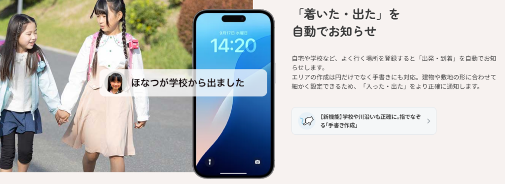 さらに乗り物(電車・バス・車)に乗ると、エリア登録をしていなくても自動で通知される機能を搭載。連れ去りや乗り過ごしにいち早く気づける仕組みです。