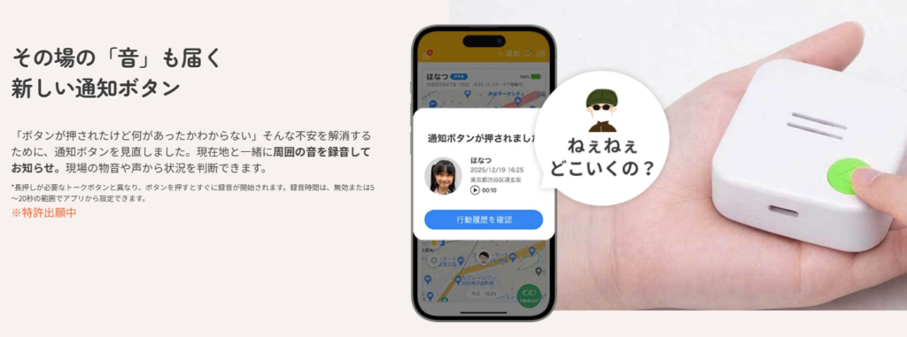 みもりGPSトークの2026年モデルから、ボタンを1回押すだけで現在地と周囲の音を自動録音してスマホへ通知する機能が搭載されました。
